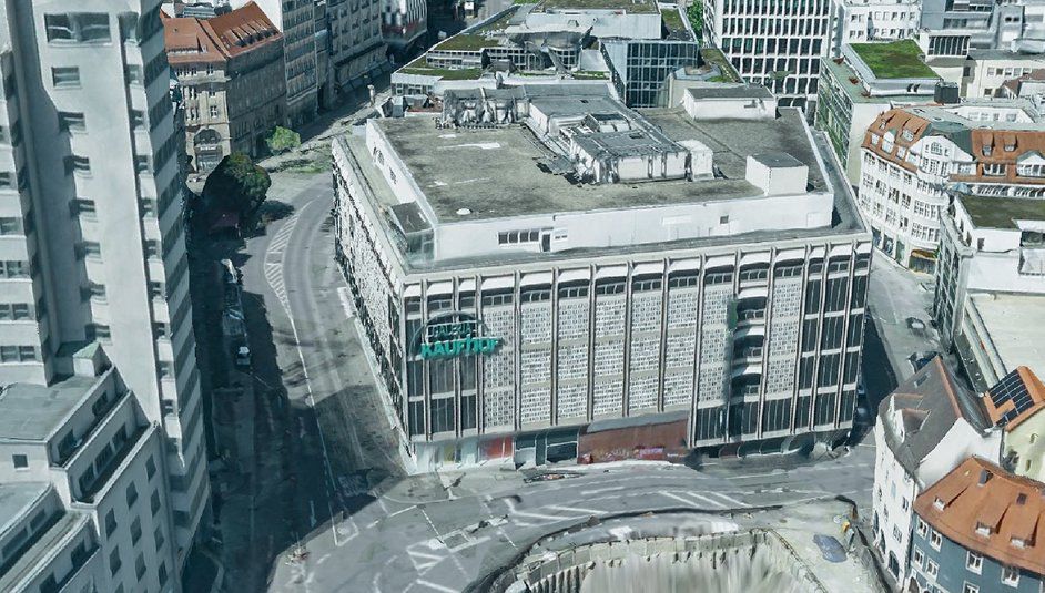 For any further use of the buildings, various factors must be considered. The parking garage cannot be operated completely independently from the former Kaufhof building, as essential supply systems are controlled via the Kaufhof property. Additionally, the parking garage is subject to several parking space obligations as well as access rights to the underground levels of adjacent properties. In the event of a partial demolition of the former Kaufhof building, it is important to ensure that the remaining building sections are sufficiently braced and that buoyancy safety is guaranteed. Furthermore, detailed investigations and repair measures of the structural framework will be necessary to enable continued use.